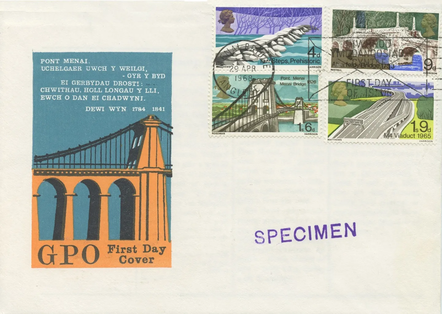 | Stamp Details: | 4d Tarr Steps, Dulverton 9d Aberfeldy Bridge 1s 6d Menai Bridge 1s 9d M4 Viaduct, Chiswick |