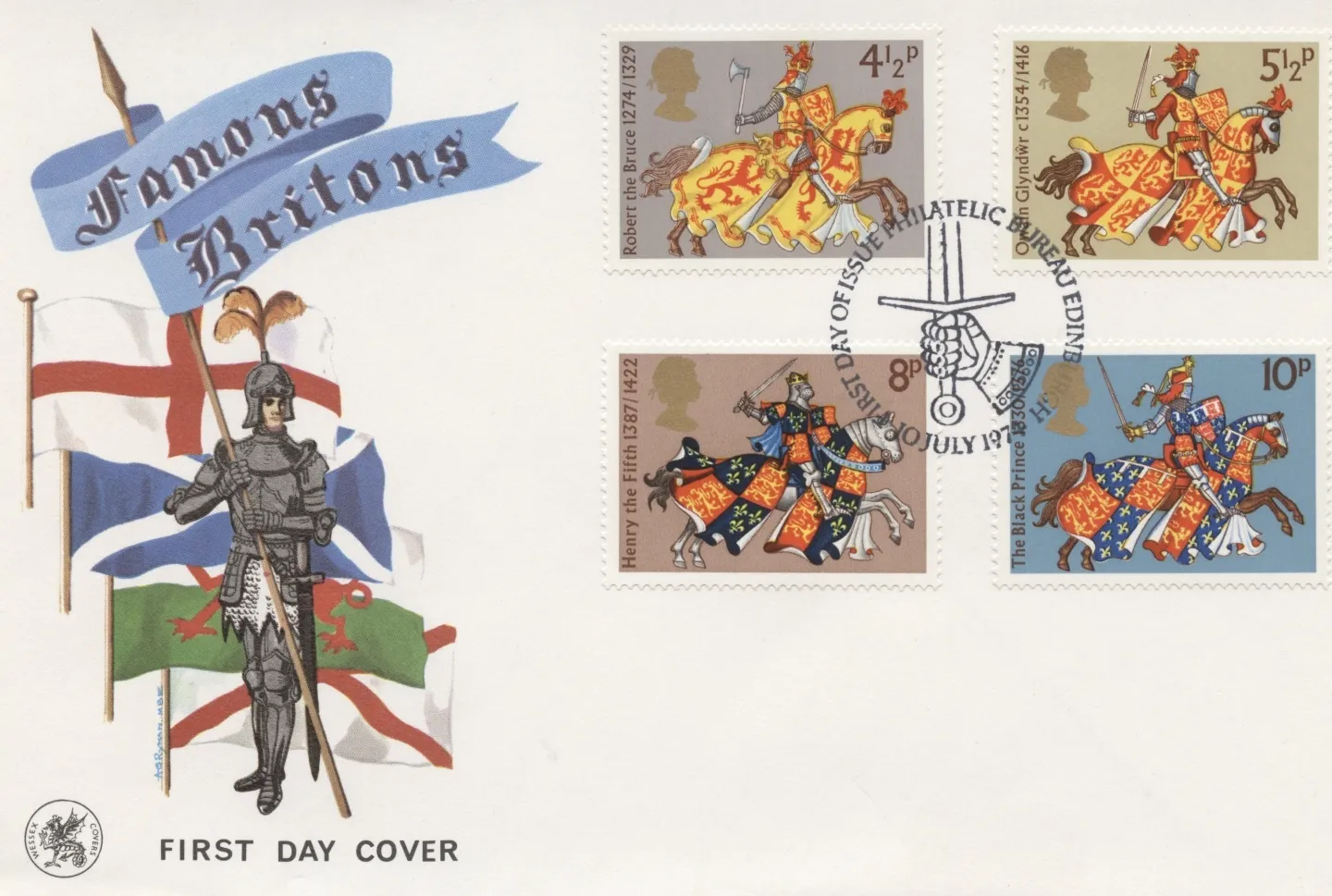 | Stamp Details: | 4 1/2p Robert the Bruce 5 1/2p Owain Glyndwr 8p Henry V 10p Edward of Woodstock |