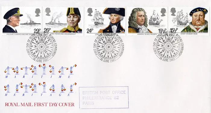 | Stamp Details: | 15 1/2p Henry VIII and Mary Rose 19 1/2p Blake and Triumph 24p Nelson and Victory 26p Fisher and Dreadnought 29p Cunningham and Warspite |