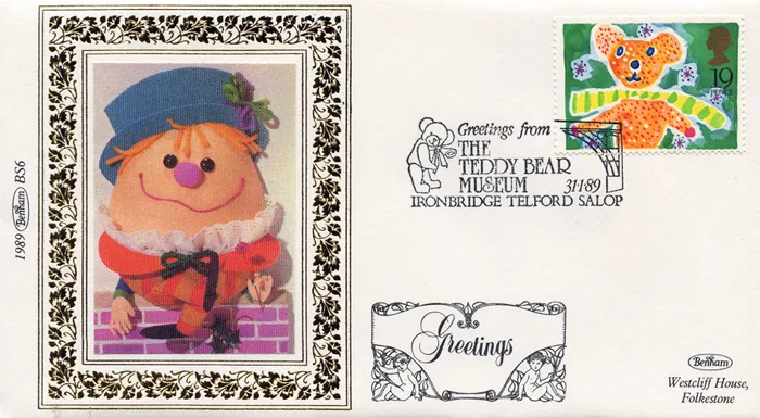 The above Royal Mail Greetings Stamps were issued on 31 January 1989 by Royal Mail and feature the following stamp designs: 19p Rose; 19p Cupid; 19p Sailing Boat; 19p Fruit; 19p Teddy Bear. The Humpty Dumpty first day cover with the Ironbridge, The Teddy Bear Museum, Special Handstamp postmark has been produced by Benham and features these stamps which can make a very collectible and lovely gift.