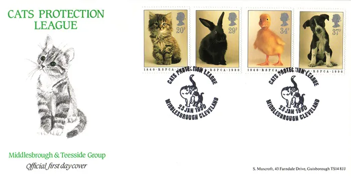 | Postmark: | Middlesbrough, Horsham, Philatelic Bureau, Shoreham, Catsfield, Ballynahinch, Cats Protection League, Special Handstamp, HQ of the RSPCA hands around dove, Special Handstamp, hands holding cat, Special Handstamp, Cat World Magazine, Special Handstamp, CDS Postmark, HQ of the RSPCA, CDS Postmark, home of Col. R Martin - Humanity Dick - author of the first law to protect animals, CDS Postmark |