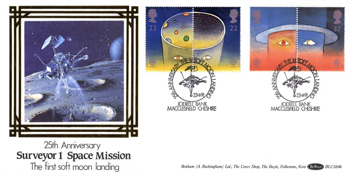 The above Royal Mail Europe in Space were issued on 23 April 1991 by Royal Mail and feature the following stamp designs: 2 x 22p Man looking into Space; 2 x 37p Space looking at Men. The Surveyor 1 Space Mission first day cover with the Macclesfield, 25th Anniveersary of the 1st Soft Moon Landing, Special Handstamp postmark has been produced by Benham and features these stamps which can make a very collectible and lovely gift.