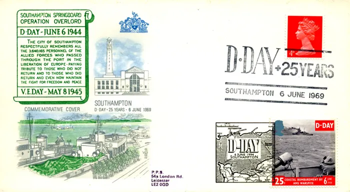 | Stamp Details: | 25p RAF Bostons 25p HMS Warspite 25p Commandos on Gold Beach 25p Infantry on Sword Beach 25p Tank and Infantry advancing at Ousitreham |