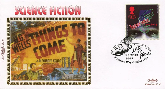The above Royal Mail Science Fiction were issued on 06 June 1995 by Royal Mail and feature the following stamp designs: 25p Time Machine; 30p First Men in the Moon; 35p War of the Worlds; 41p Shape of Things to Come. The Things to Come - H G Wells first day cover with the London, Starboard Way - Into the Future, Special Handstamp postmark has been produced by Benham and features these stamps which can make a very collectible and lovely gift.