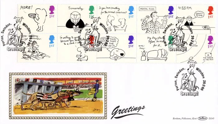 The above Royal Mail Cartoons (Greetings) were issued on 26 February 1996 by Royal Mail and feature the following stamp designs: 1st More Love; 1st Sincerely; 1st Human Condition; 1st Mental Floss; 1st 4.55 PM; 1st Dear Lottery Prize Winner; 1st I'm writing to you because; 1st Fetch this, fetch that; 1st My day starts before I'm ready for it; 1st The Cheque in the Post. The Greyhounds chase postman first day cover with the Purton, Swindon, Dog and Cat, Special Handstamp postmark has been produced by Benham and features these stamps which can make a very collectible and lovely gift.