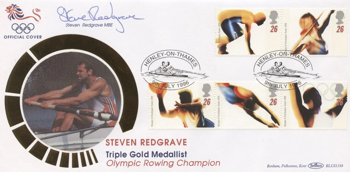 The above Royal Mail Olympic Games 1996 were issued on 09 July 1996 by Royal Mail and feature the following stamp designs: 26p Athlete; 26p Javelin; 26p Basketball; 26p Swimming; 26p Athlete and Olympic Rings. The Steve Redgrave signed first day cover with the Henley on Thames, Special Handstamp postmark has been produced by Benham and features these stamps which can make a very collectible and lovely gift.