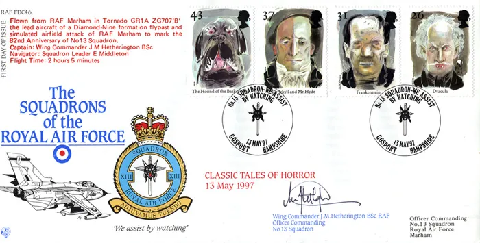 The above Royal Mail Tales of Terror were issued on 13 May 1997 by Royal Mail and feature the following stamp designs: 26p Dracula; 31p Frankenstein; 37p Dr Jekyll and Mr Hyde; 43p The Hound of the Baskervilles. The Squadrons of the Royal Air Force first day cover with the BFPS - Forces, No.13 Squadron, Special Handstamp postmark has been produced by Forces and features these stamps which can make a very collectible and lovely gift.