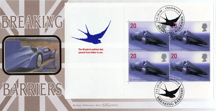 The above Royal Mail PSB: Speed Records - Pane 1 were issued on 13 October 1998 by Royal Mail and feature the following stamp designs: . The Bluebird first day cover with the Chislehurst, Bluebird - Breaking Barriers, Special Handstamp postmark has been produced by Benham and features these stamps which can make a very collectible and lovely gift.