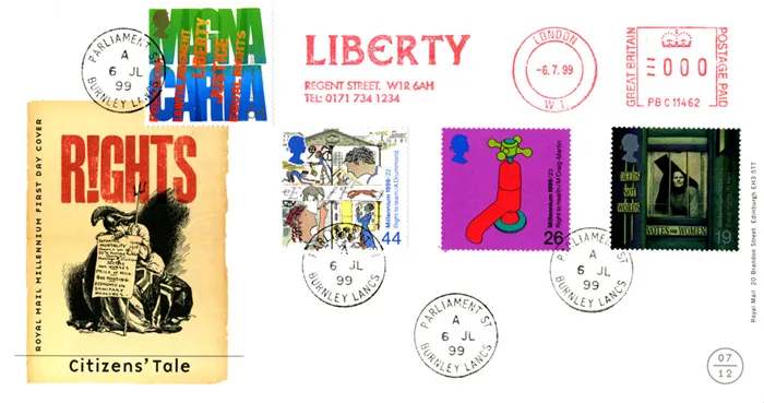 | Stamp Details: | 19p Votes for Women 26p Right to Health 44p Right to Learn 64p Magna Carta |