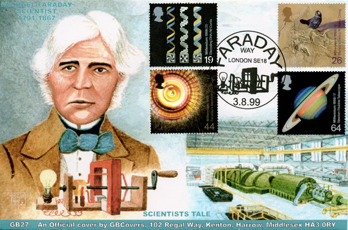 The above Royal Mail Scientists' Tale were issued on 03 August 1999 by Royal Mail and feature the following stamp designs: 19p Decoding DNA; 26p Darwin's Theory; 44p Faraday; 64p Newton. The Michael Faraday first day cover with the London, Faraday Way, Special Handstamp postmark has been produced by Derek Williams and features these stamps which can make a very collectible and lovely gift.