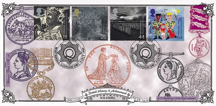The above Royal Mail Soldiers' Tale were issued on 05 October 1999 by Royal Mail and feature the following stamp designs: 19p Bannockburn; 26p Civil War; 44p World Wars; 64p Peace keeping. The Victorian Medals first day cover with the Whitehall, Whitehall, The Barracks, Special Handstamp, Special Handstamp, CDS Postmark postmark has been produced by Bradbury and features these stamps which can make a very collectible and lovely gift.