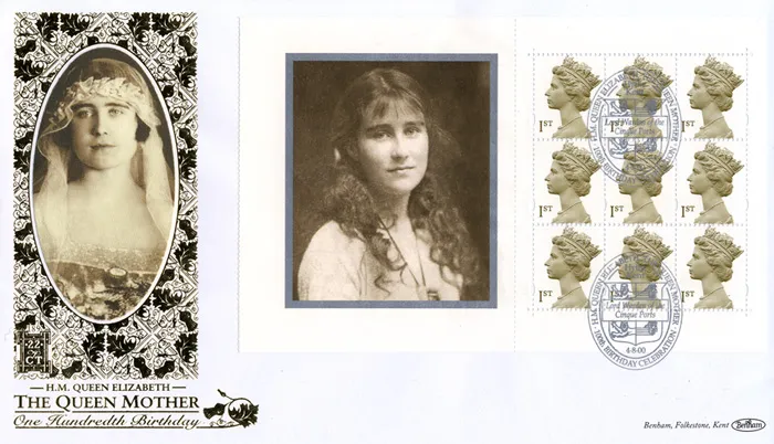 The above Royal Mail PSB: Queen Mother - Pane 2 were issued on 04 August 2000 by Royal Mail and feature the following stamp designs: . The Elizabeth Bowes Lyon first day cover with the Hythe, Lord Warden of the Cinque Ports, Special Handstamp postmark has been produced by Benham and features these stamps which can make a very collectible and lovely gift.