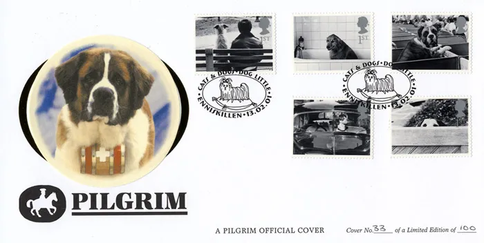 The above Royal Mail Cats & Dogs were issued on 13 February 2001 by Royal Mail and feature the following stamp designs: 10 x 1st Class Cats and Dogs photographs. The St Bernard first day cover with the Enniskillen, Poodle, Special Handstamp postmark has been produced by Benham and features these stamps which can make a very collectible and lovely gift.