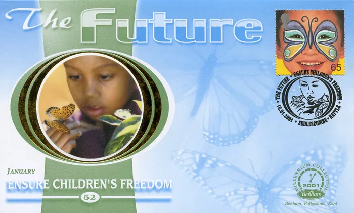 The above Royal Mail The Future were issued on 16 January 2001 by Royal Mail and feature the following stamp designs: 2nd Nurture Children (flower); 1st Listen to Children (tiger); 45p Teach Children (owl); 65p Children's Freedom (butterfly). The Child with Butterfly first day cover with the Sedlescombe, Child with Butterfly, Special Handstamp postmark has been produced by Benham and features these stamps which can make a very collectible and lovely gift.
