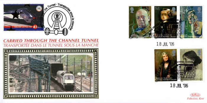 The above Royal Mail National Portrait Gallery were issued on 18 July 2006 by Royal Mail and feature the following stamp designs: 1st Sir Winston Churchill; 1st Sir Josuha Reynolds; 1st T.S. Elliot; 1st Emmeline Pankhurst; 1st Virginia Woolf; 1st Sir Walter Scott; 1st Mary Seacole; 1st William Shakespeare; 1st Dame Cicely Saunders; 1st Charles Darwin. The Historic Channel Tunnel first day cover with the Folkestone, Historic Channel Tunnel, Special Handstamp postmark has been produced by Benham and features these stamps which can make a very collectible and lovely gift.