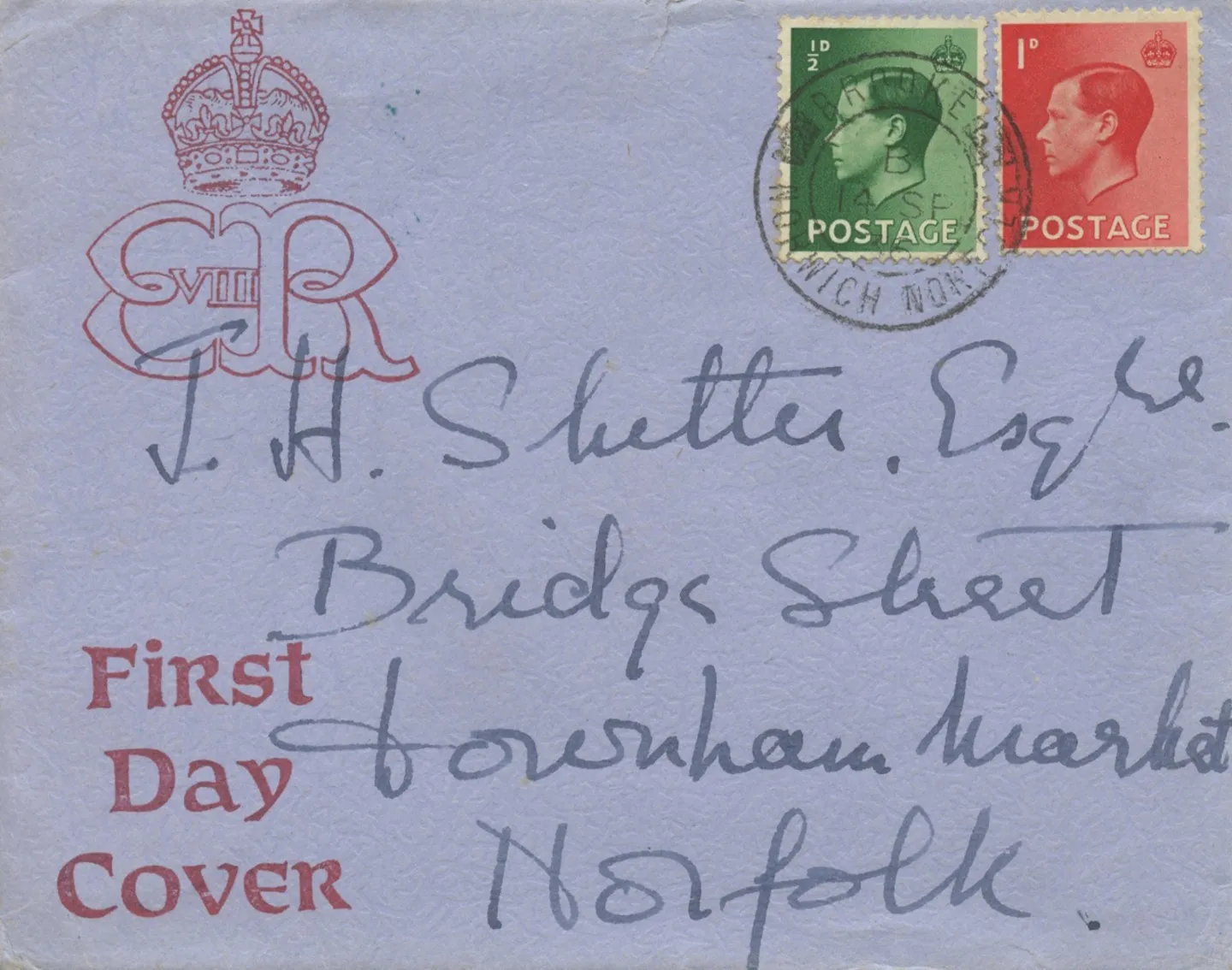 The 1d Red King Edward VIII stamp with recently added rubber stamp cachet with neat hand written address.