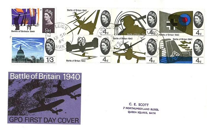 | Stamp Details: | 4d Spitfire 4d Hurricane 4d Wing Tips 4d Spitfires and Heinkel 4d Spitfire and Stuka Dive-bomber 4d Hurricane and Wreck of Dornier 9d Anti-Aircraft Artillery 1s 3d Air Battle over St. Paul's |
