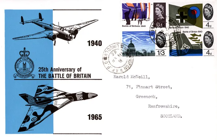 | Stamp Details: | 4d Spitfire 4d Hurricane 4d Wing Tips 4d Spitfires and Heinkel 4d Spitfire and Stuka Dive-bomber 4d Hurricane and Wreck of Dornier 9d Anti-Aircraft Artillery 1s 3d Air Battle over St. Paul's |