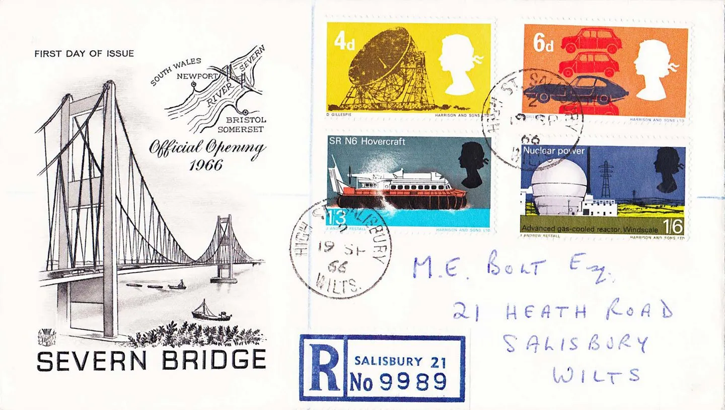 | Stamp Details: | 4d Jodrell Bank 6d Motor Cars 1s 3d Hovercraft 1s 6d Nuclear Power |