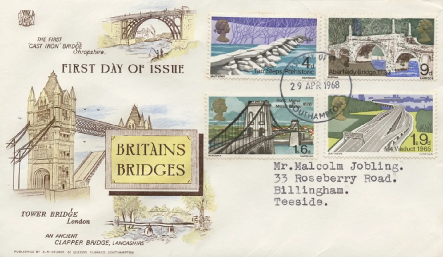 | Stamp Details: | 4d Tarr Steps, Dulverton 9d Aberfeldy Bridge 1s 6d Menai Bridge 1s 9d M4 Viaduct, Chiswick |