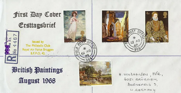 The above Royal Mail British Paintings 1968 were issued on 12 August 1968 by Royal Mail and feature the following stamp designs: 4d Elizabeth I (artist unknown); 1s Pinkie (Lawrence); 1s 6d Ruins of St. Mary le Port (Piper); 1s 9d Hay Wain (Constable). The RAF Bruggen first day cover with the Field Post Office, No 986, CDS Postmark postmark has been produced by Forces and features these stamps which can make a very collectible and lovely gift.