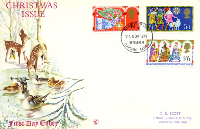 | Stamp Details: | 4d Herald Angel 5d The Three Shepherds 1/6d The Three Kings |