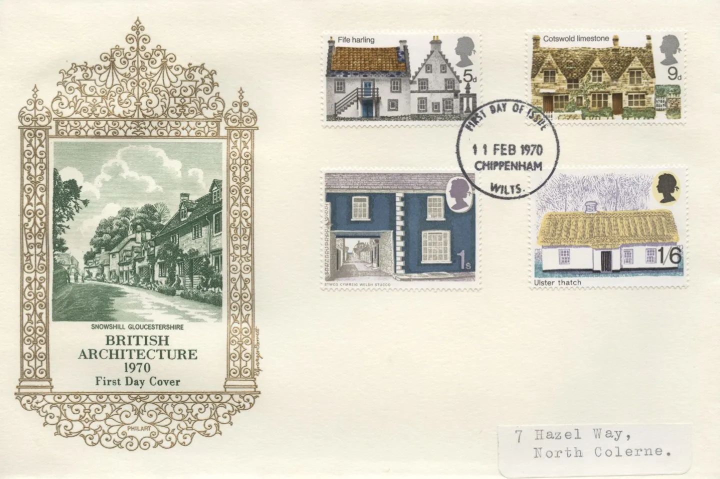 | Stamp Details: | 5d Fife harling 9d Cotswold limestone 1s Welsh stucco 1s 6d Ulster thatch |