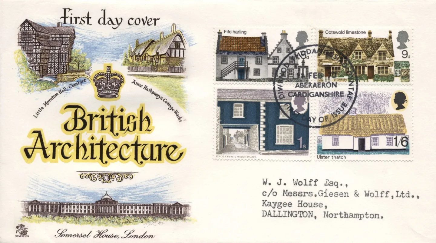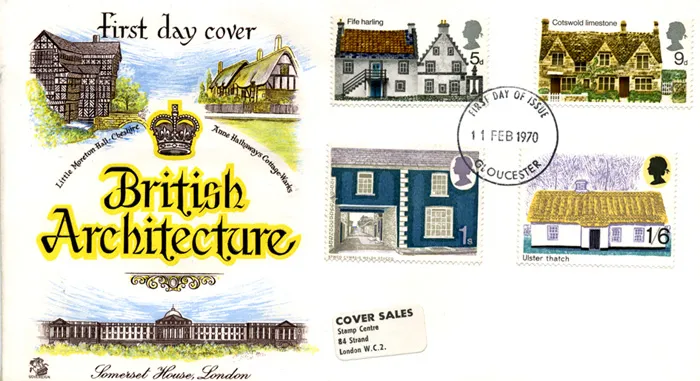 | Stamp Details: | 5d Fife harling 9d Cotswold limestone 1s Welsh stucco 1s 6d Ulster thatch |