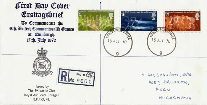 The above Royal Mail Commonwealth Games 1970 were issued on 15 July 1970 by Royal Mail and feature the following stamp designs: 5d Runners; 1s 6d Swimmers; 1s 9d Cyclists. The RAF Bruggen first day cover with the Forces Post Office, 9, CDS Postmark postmark has been produced by Forces and features these stamps which can make a very collectible and lovely gift.