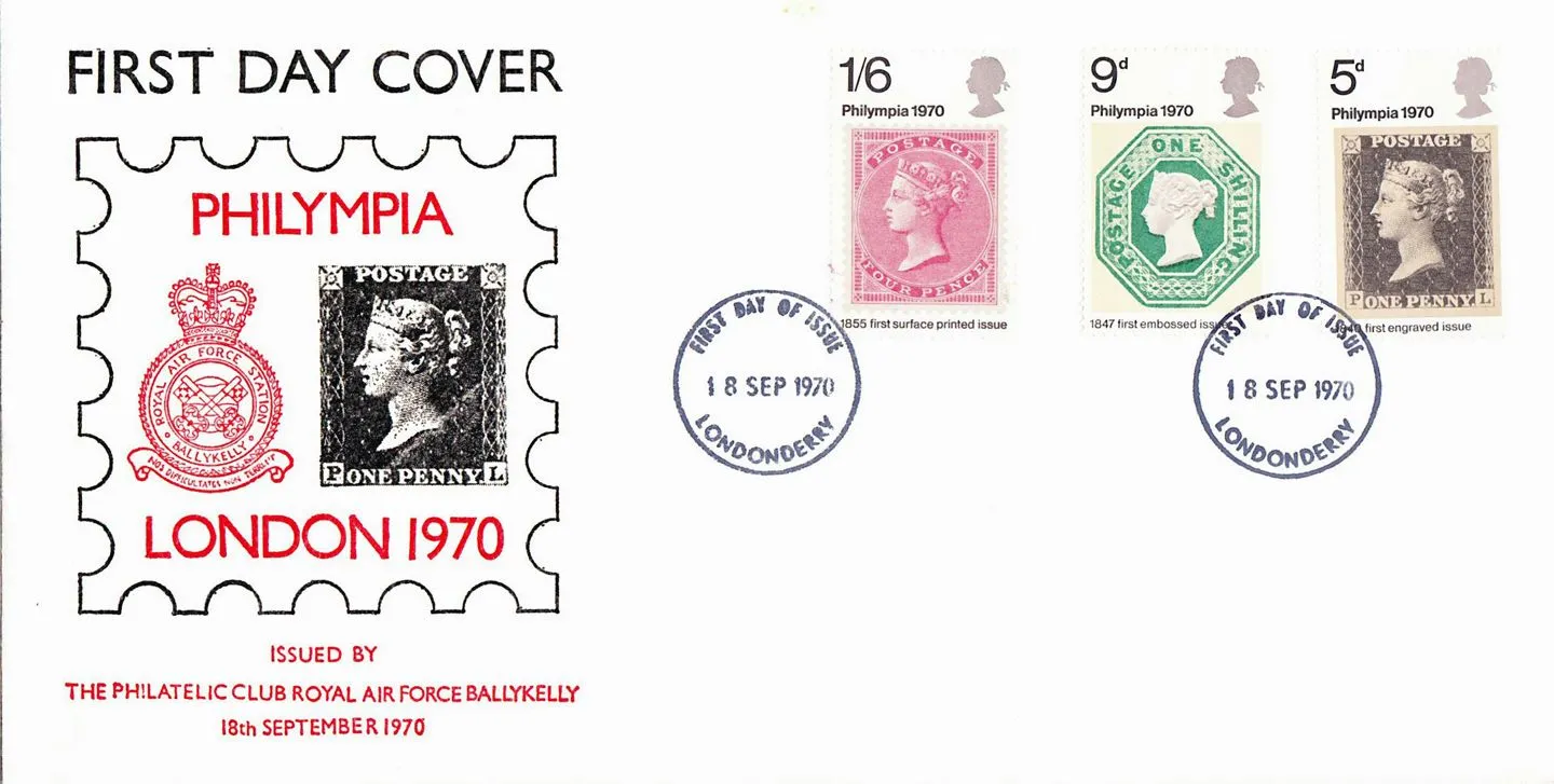The above Royal Mail 'Philympia' were issued on 18 September 1970 by Royal Mail and feature the following stamp designs: 5d (Penny Black); 9d (1s Green); 1s 6d (4d Carmine). The Penny Black first day cover with the Londonderry, FDI Postmark postmark has been produced by Forces and features these stamps which can make a very collectible and lovely gift.