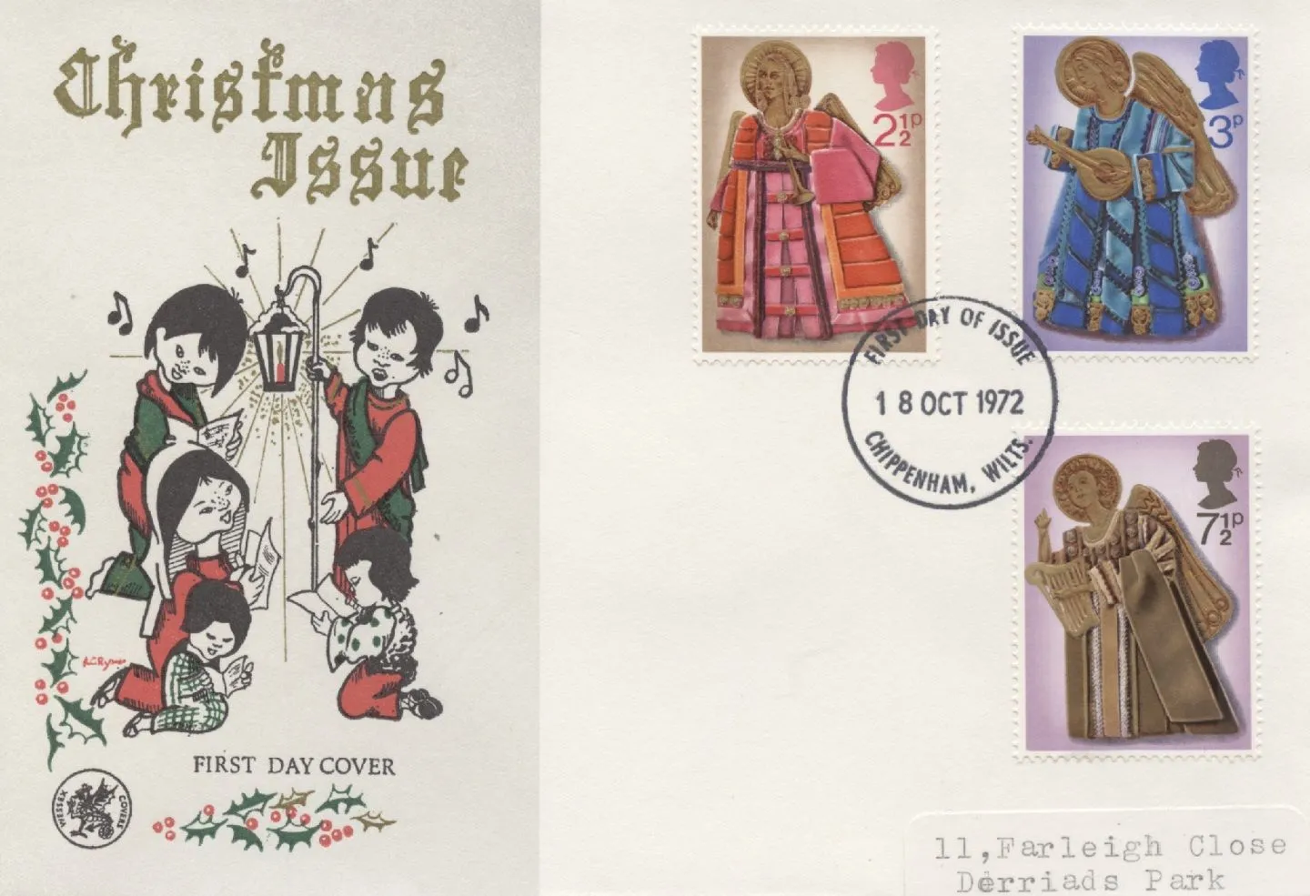 | Stamp Details: | 2 1/2p Angel and Trumpet 3p Angel and Lute 7 1/2p Angel and Harp |