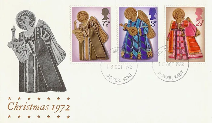 | Stamp Details: | 2 1/2p Angel and Trumpet 3p Angel and Lute 7 1/2p Angel and Harp |