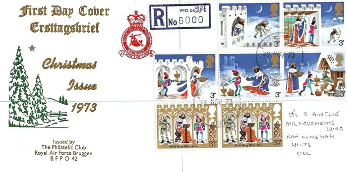 The above Royal Mail Christmas 1973 were issued on 28 November 1973 by Royal Mail and feature the following stamp designs: 5 x 3p 'Good King Wenceslas'; 3 1/2p 'Good King Wenceslas'. The RAF Bruggen first day cover with the Forces Post Office, No 62, CDS Postmark postmark has been produced by Forces and features these stamps which can make a very collectible and lovely gift.