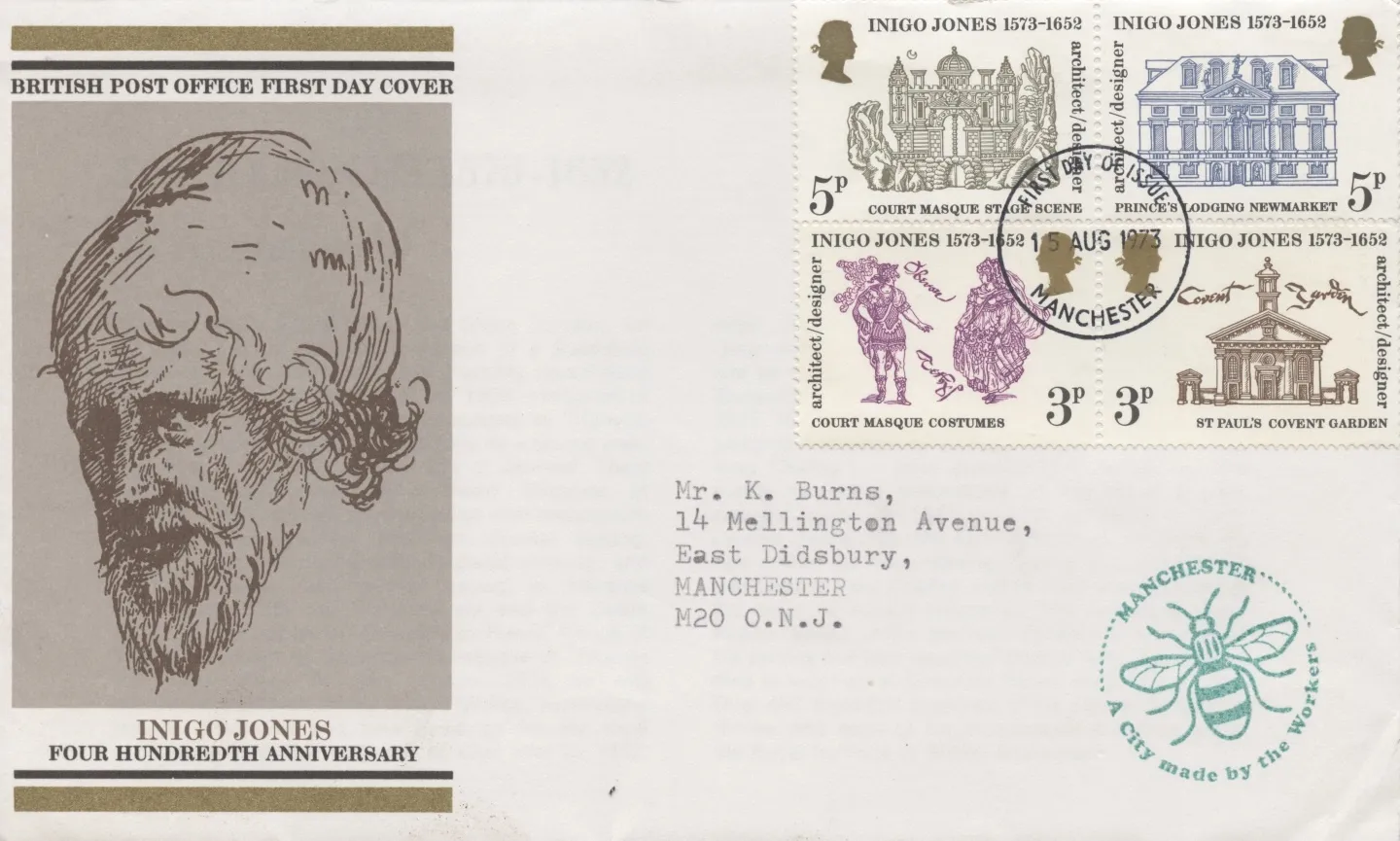 The above Royal Mail Inigo Jones were issued on 15 August 1973 by Royal Mail and feature the following stamp designs: 3p Court Masque Costumes; 3p St. Paul's, Covent Garden; 5p Prince's Lodging, Newmarket; 5p Court Masque Stage Scene. The Manchester Bee Cachet first day cover with the Manchester, FDI Postmark postmark has been produced by Royal Mail/Post Office and features these stamps which can make a very collectible and lovely gift.