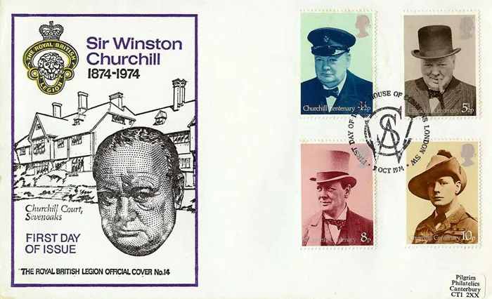 | Stamp Details: | 4 1/2p Churchill in Royal Yacht Squadron Uniform 5 1/2p Prime Minister in 1940 8p Secretary for War and Air 1919 10p War Correspondent in South Africa 1899 |