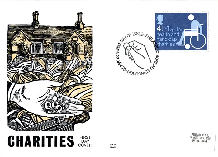 The above Royal Mail Charity were issued on 22 January 1975 by Royal Mail and feature the following stamp designs: 4 1/2p + 1 1/2p donation to charities. The Almshouse first day cover with the Philatelic Bureau, Special Handstamp postmark has been produced by Benham and features these stamps which can make a very collectible and lovely gift.