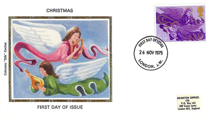| Stamp Details: | 6 1/2p Angel with harp 8 1/2p Angel with mandolin 11p Angel with horn 13p Angel with trumpet |