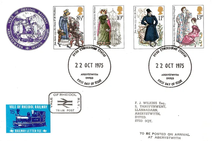 | Stamp Details: | 8 1/2p Emma and Mr. Woodhouse 10p Catherine Morland 11p Mr. Darcy 13p Mary and Henry Crawford |