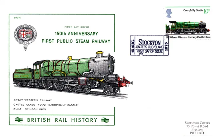 The above Royal Mail Stockton & Darlington Railway were issued on 13 August 1975 by Royal Mail and feature the following stamp designs: 7p Stephenson's Locomotion; 8p Waverley Class; 10p Caerphilly Castle; 12p High Speed Train. The GWR Castle Class: Caerphilly Castle' first day cover with the Stockton on Tees, First Day of Issue - Ticket, Special Handstamp postmark has been produced by Scotsman Covers and features these stamps which can make a very collectible and lovely gift.