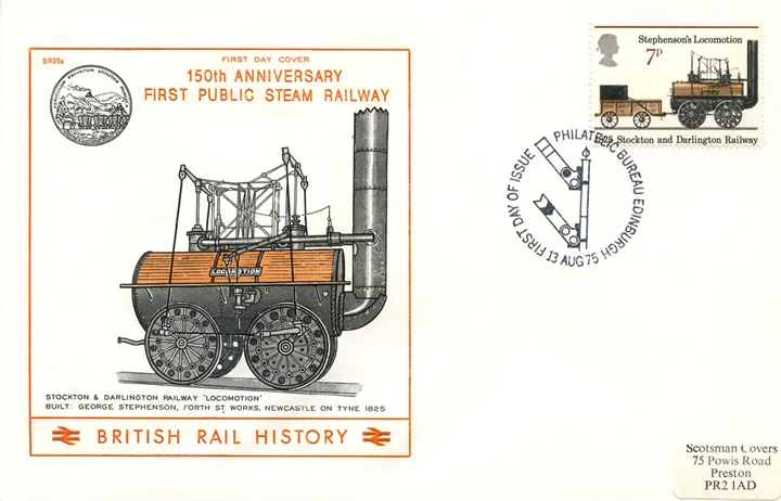 The above Royal Mail Stockton & Darlington Railway were issued on 13 August 1975 by Royal Mail and feature the following stamp designs: 7p Stephenson's Locomotion; 8p Waverley Class; 10p Caerphilly Castle; 12p High Speed Train. The Locomotion first day cover with the Philatelic Bureau, Ticket, Special Handstamp postmark has been produced by Scotsman Covers and features these stamps which can make a very collectible and lovely gift.