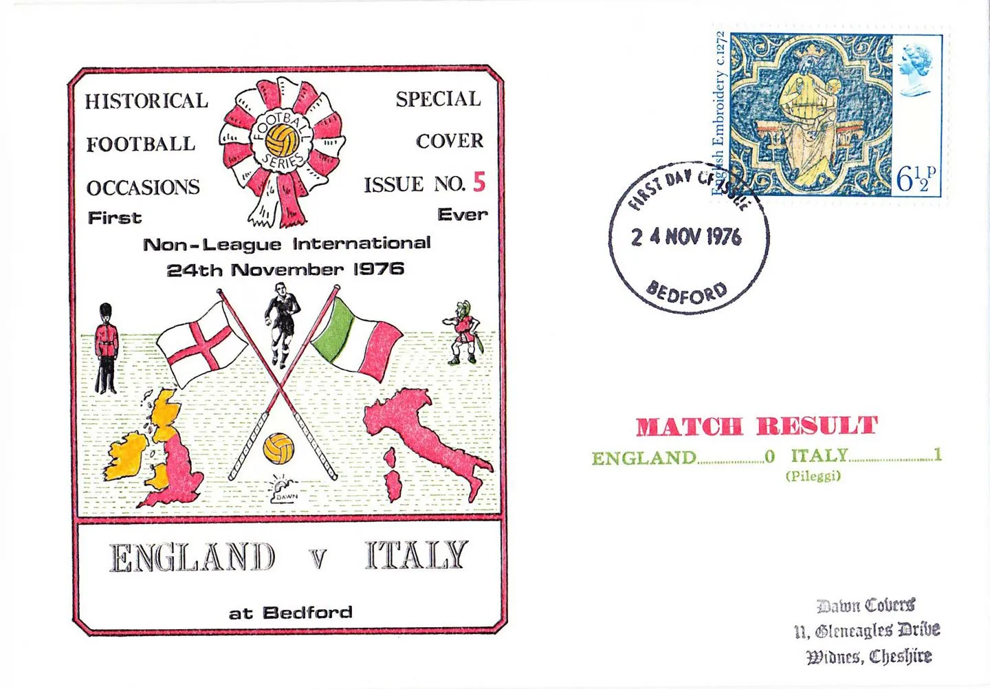 The above Royal Mail Christmas 1976 were issued on 24 November 1976 by Royal Mail and feature the following stamp designs: 6 1/2p Virgin & Child; 8 1/2p Angel; 11p Angel and Shepherds; 13p Three Kings. The England v Italy first day cover with the Bedford, FDI Postmark postmark has been produced by Dawn and features these stamps which can make a very collectible and lovely gift.