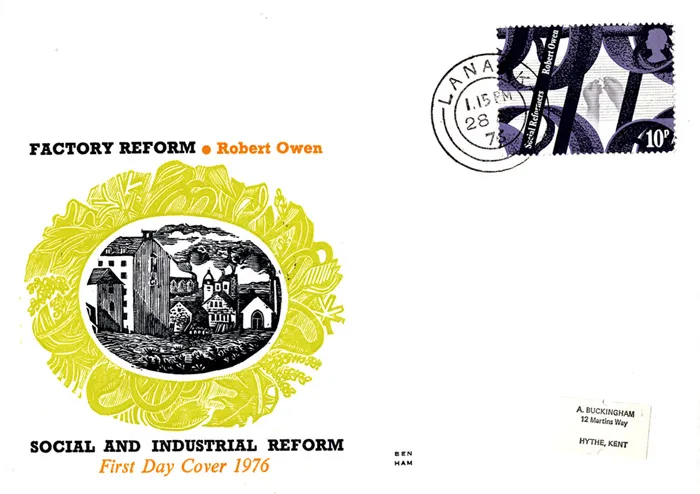 The above Royal Mail Social Reformers were issued on 28 April 1976 by Royal Mail and feature the following stamp designs: 8 1/2p Thomas Hepburn; 10p Robert Owen; 11p Lord Shaftesbury; 13p Elizabeth Fry. The Factory Reform - Robert Owen first day cover with the Lanark, Robert Owen's Experiment, CDS Postmark postmark has been produced by Benham and features these stamps which can make a very collectible and lovely gift.