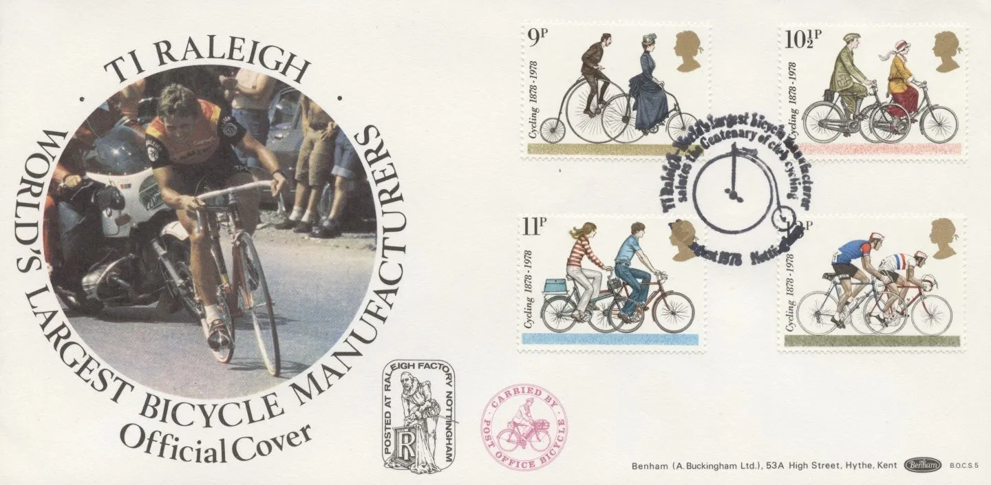 The above Royal Mail Cycling Centenaries were issued on 02 August 1978 by Royal Mail and feature the following stamp designs: 9p Penny Farthing; 10 1/2p Touring Bicycles; 11p Modern Bikes; 13p Road Racers. The TI Raleigh first day cover with the Nottingham, Nottingham, Nottingham, Tour De France, Special Handstamp, Tour De France, Special Handstamp, TI Raleigh, Special Handstamp postmark has been produced by Benham and features these stamps which can make a very collectible and lovely gift.