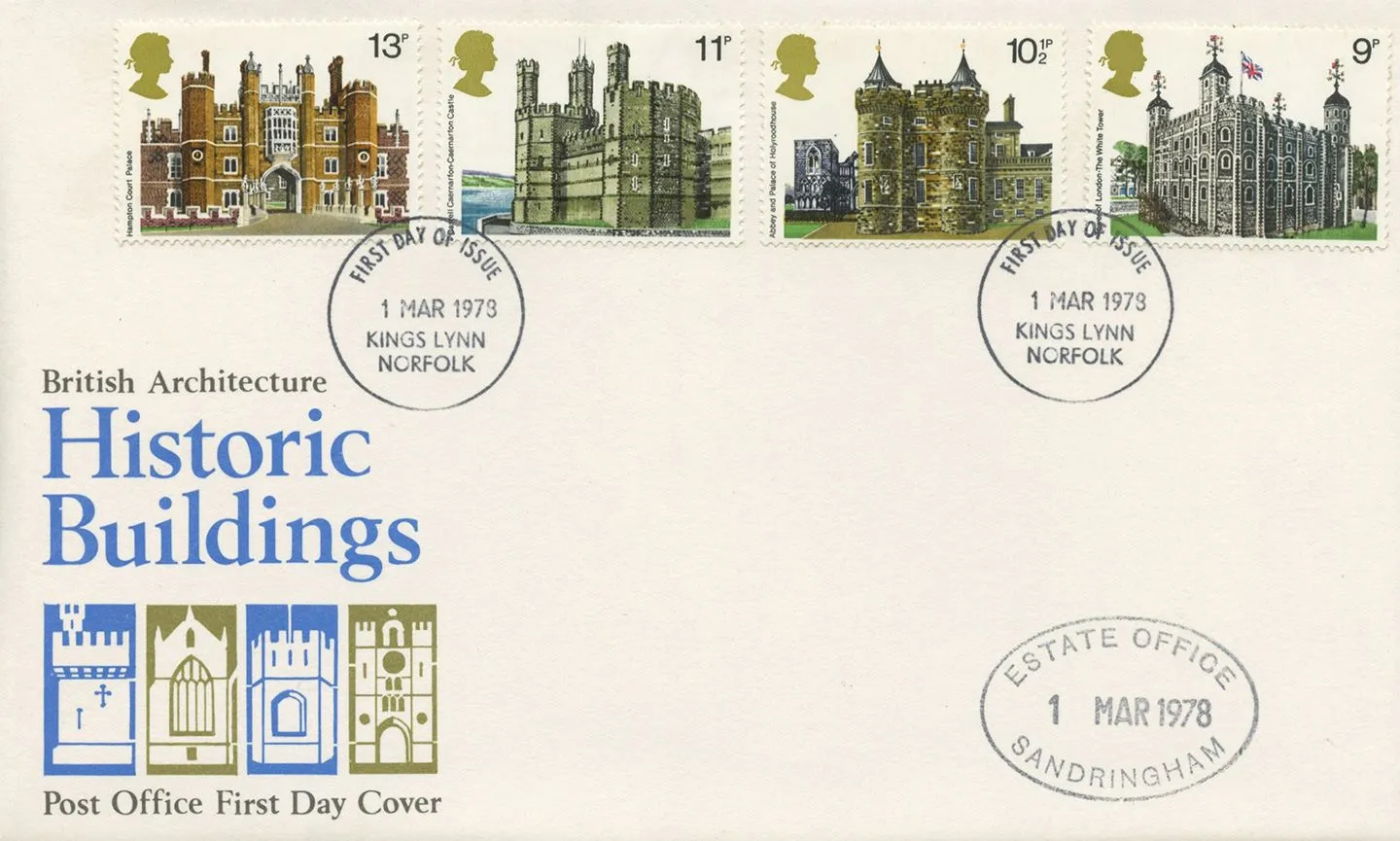 | Stamp Details: | 9p Tower of London 10 1/2 Holyroodhouse 11p Caernarvon Castle 13p Hampton Court |