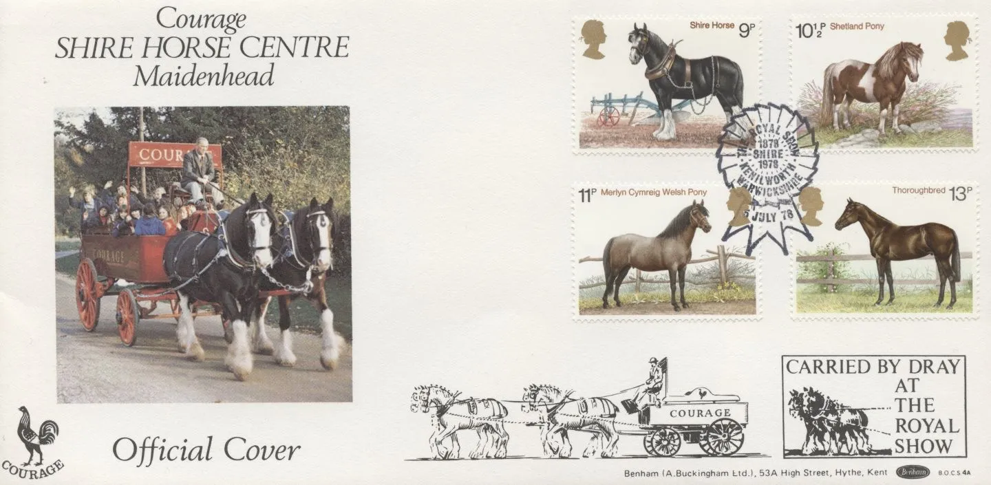 The above Royal Mail Shire Horse Society were issued on 05 July 1978 by Royal Mail and feature the following stamp designs: 9p Shire Horse; 10 1/2p Shetland Pony; 11p Welsh Pony; 13p Thoroughbred. The Courage Shire Horse Centre first day cover with the Maidenhead, Kenilworth, Maidenhead, Shire Horse Centenary, Special Handstamp, The Royal Show, Special Handstamp, Shire Horse Cenenary, Special Handstamp postmark has been produced by Benham and features these stamps which can make a very collectible and lovely gift.