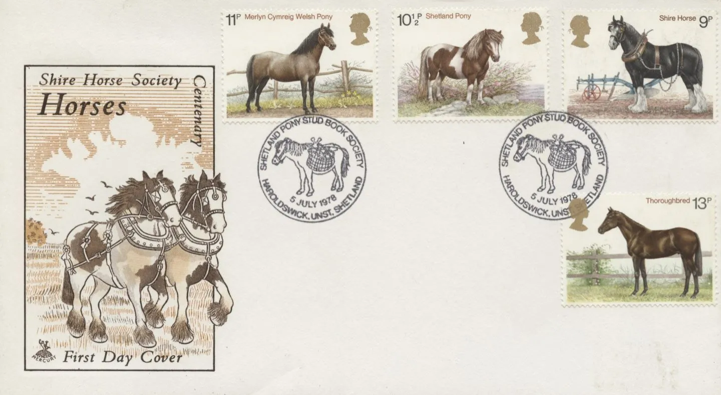 | Stamp Details: | 9p Shire Horse 10 1/2p Shetland Pony 11p Welsh Pony 13p Thoroughbred |