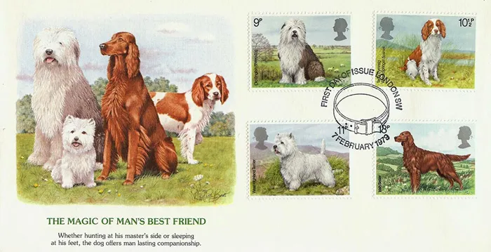 | Stamp Details: | 9p Old English Sheepdog 10 1/2p Welsh Springer Spaniel 11p West Highland Terrier 13p Irish Setter |