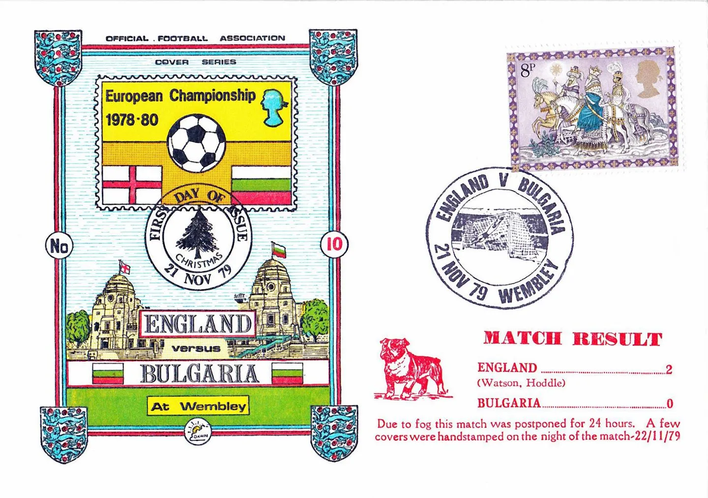 The above Royal Mail Christmas 1979 were issued on 21 November 1979 by Royal Mail and feature the following stamp designs: 8p The Three Kings; 10p Angel appearing to Shepherds; 11 1/2p The Nativity; 13p Mary & Joseph; 15p The Annunciation. The England v Bulgaria first day cover with the Wembley, England v Bulgaria, Special Handstamp postmark has been produced by Dawn and features these stamps which can make a very collectible and lovely gift.