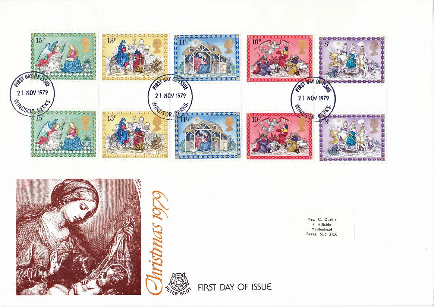 | Stamp Details: | 8p The Three Kings 10p Angel appearing to Shepherds 11 1/2p The Nativity 13p Mary & Joseph 15p The Annunciation |