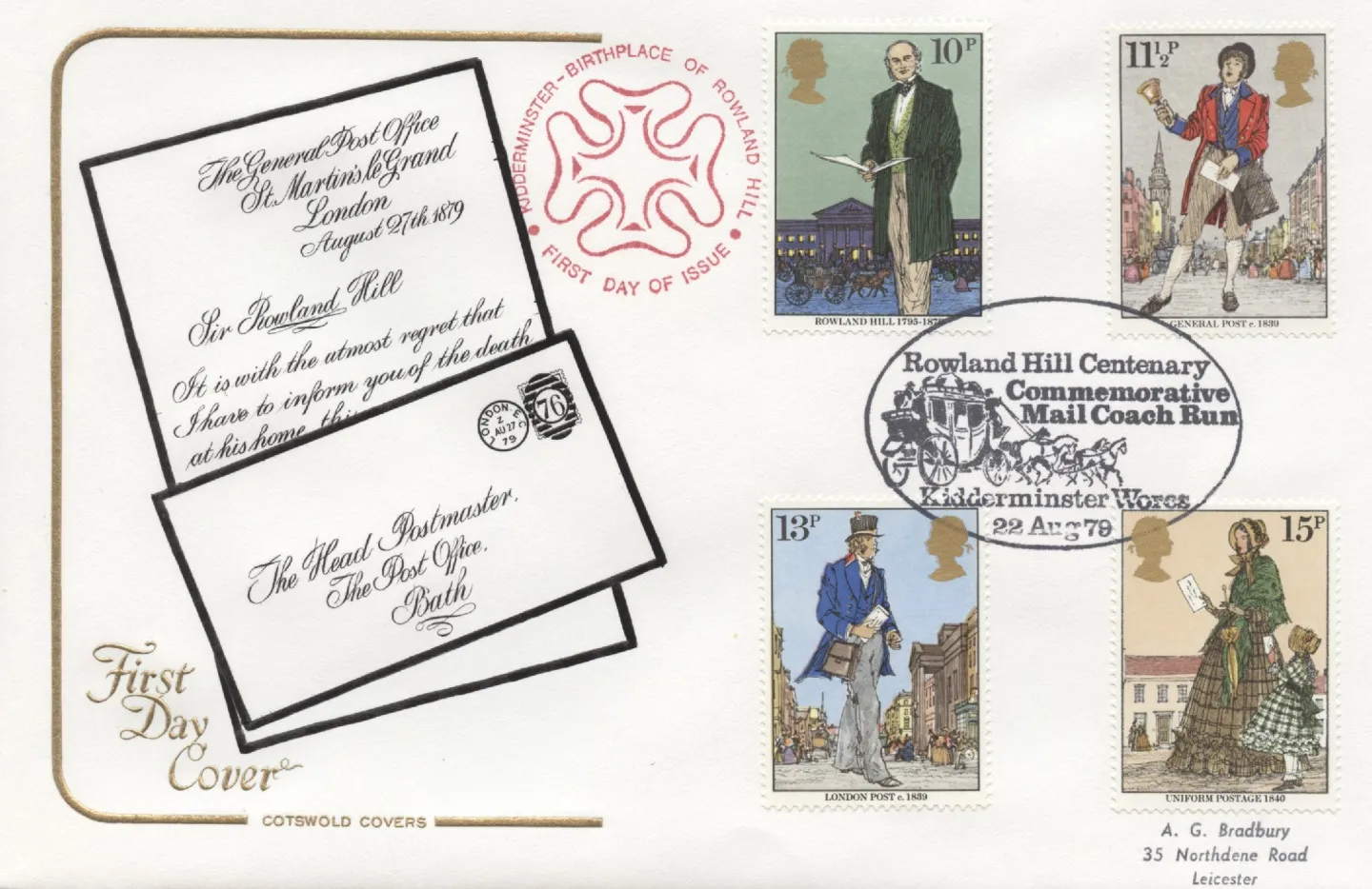 | Postmark: | Bath, Stratford upon Avon, London, Philatelic Bureau, Kidderminster, National Postal Museum, Coventry, Warwick, Liverpool, Manchester, Birmingham, London WC, Postal Museum, Special Handstamp, Special Handstamp, Mailcoach, Special Handstamp, Chief Office (Rowland Hill statue), Special Handstamp, Victoria, Special Handstamp, Maltese Cross, Special Handstamp, Skirrid Engery Drive, Special Handstamp, Wyre Forest District Council, Special Handstamp, Codesort, Special Handstamp, British Library, Special Handstamp, Bruce Castle, Special Handstamp, CDS Postmark |